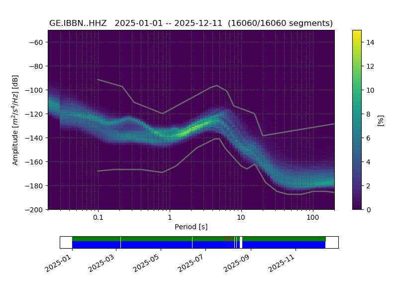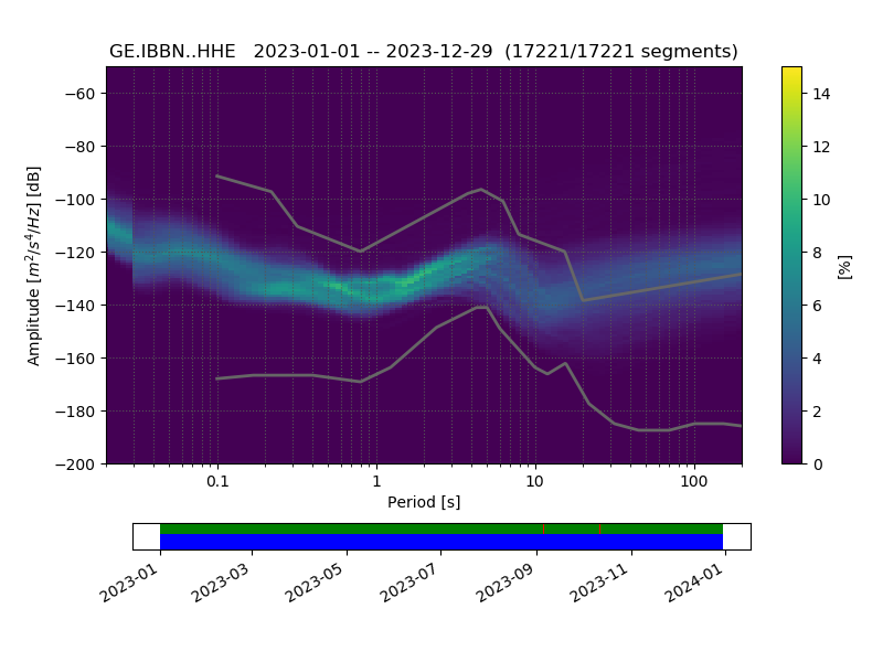 PPSD (Probability Power Spectral Density) of last year, vertical component, transformed to acceleration display.