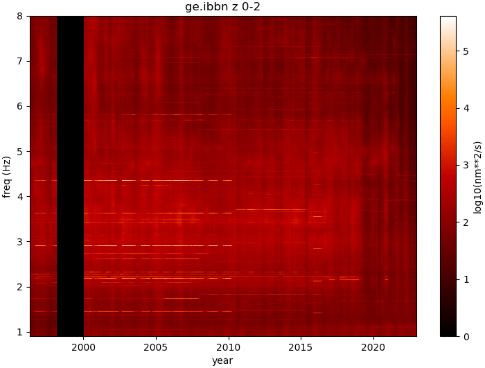 Spectrogram in 2D color display over available time period up to 25 years, vertical component, local wind speed between 3 and 6 m/s (ECMWF model in 10m height). Waveform data are segmented into pieces of 1h length, the resulting PSD values are processed for each grid frequency separately: binned using local wind speed intervals and averaged in time with a median algorithm.