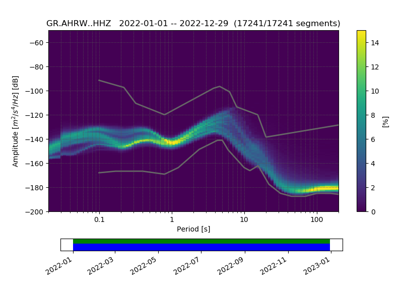 PPSD (Probability Power Spectral Density) of last year, vertical component, transformed to acceleration display.