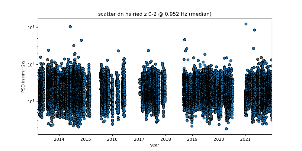 From hourly PSD spectra one frequency is selected and displayed over the whole time span of available data (blue points). A median average curve is computed and plotted in red. Broadband stations will be displayed at frequency 0.15 Hz all other stations at 0.95 Hz. At 0.15 Hz a clear seasonal variation (low in summer, high in winter) should be visible.
