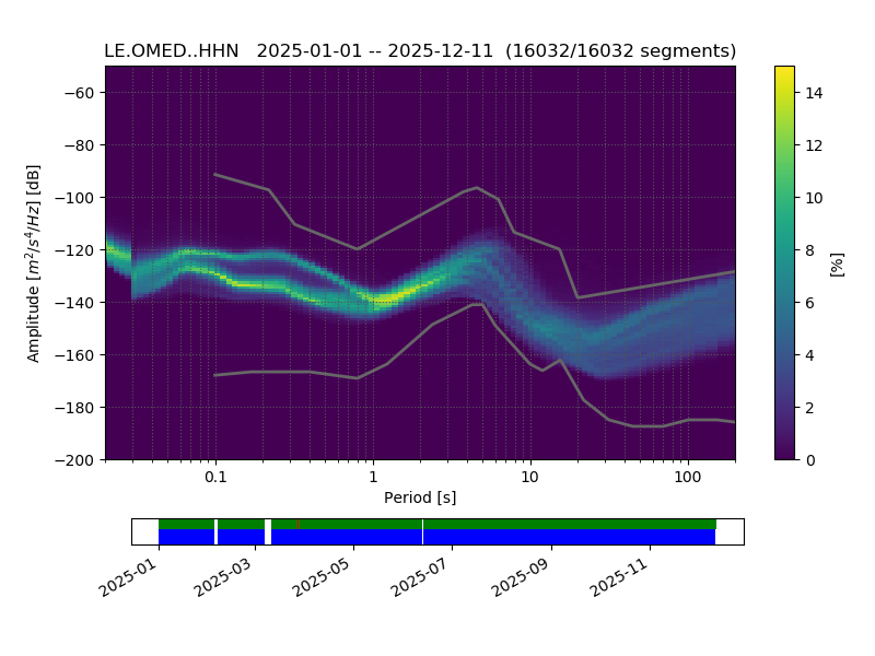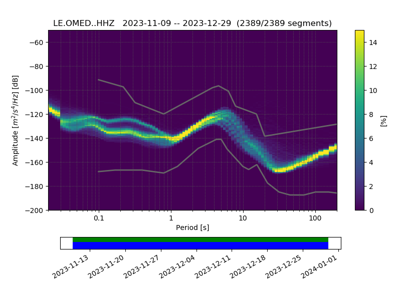 PPSD (Probability Power Spectral Density) of last year, vertical component, transformed to acceleration display.