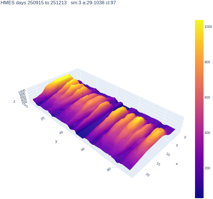 Please note that the color is scaled for each figure individually, the the scaling with absolute values is shown in the color bar to the right. The 3D figures are slightly smoothed and reduced to make them lighter for handling with javascript. Still it takes a few moments for the 3D figures to show up. All long term spectrograms are updated once a year.