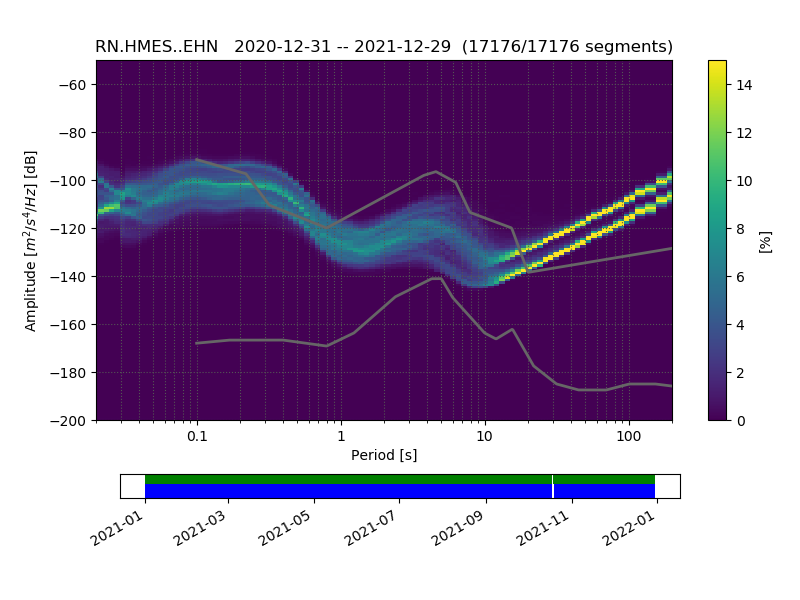 PPSD (Probability Power Spectral Density) of last year, vertical component, transformed to acceleration display.