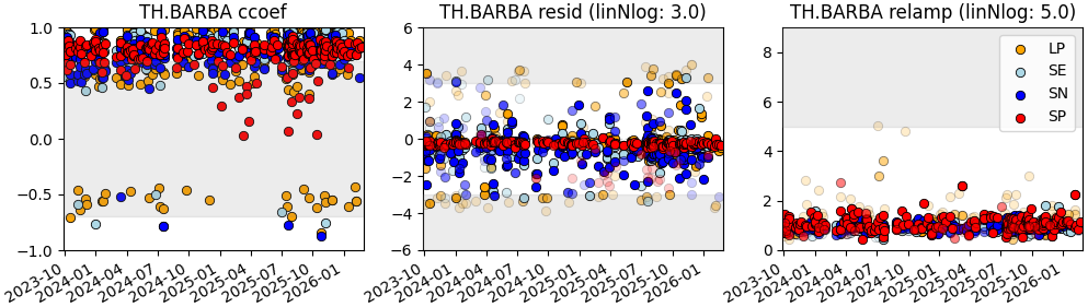 Correlating signals of teleseismic events between stations reveal possible issues in timing, waveform shape and amplitudes. The x-axis on all diagrams is the event time. The left figure contains the correlation coefficients ranging between -1 and 1. The area between -0.7 and 0.7 is shaded in gray to indicate bad correlation values. The central figure shows the time residuals (in seconds, vertical axis) of the correlation maximum. In an ideal case the values are aligned along the dashed zero line. A mean deviation from zero indicate station corrections in travel time. To be able to display also large residual values the shaded areas at the bottom and on top provide a logarithmic scaling rather than the linear scaling in the central part. Residuals corresponding to low correlation coefficients (below 0.7) have a reduced alpha value appearing less bold in the figure. The right diagram displays the relative amplitude measurements of this station compared to all others on the vertical axis. The dashed line indicates a relative amplitude of 1. The shaded area again indicates logarithmic scaling for large amplitude deviations. Red points result from WWSSN-SP simulations, orange from SRO-LP. Dark blue and light blue show results for horizontal components N and E, respectively, using a KIRNOS simulation. This figure is updated on every new event analysed.