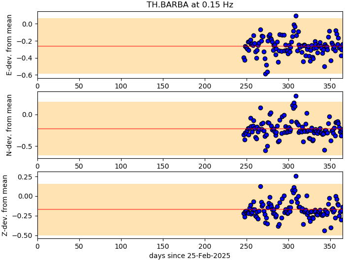 The amplitude stability is checked at a frequency of 0.15 Hz for broadband stations and 1 Hz otherwise. For each of the last 365 days an average PSD amplitude at this frequency is determined and compared with the average of all other stations. The figure shows the deviation from this global average together with the mean (red line) and a tolerance area based on multiples of the standard deviation (orange area). A station with stable amplitudes has all day dots in all components within this range. Trends or steps in this amplitude display may indicate problems with data or metadata. This figure is updated daily.