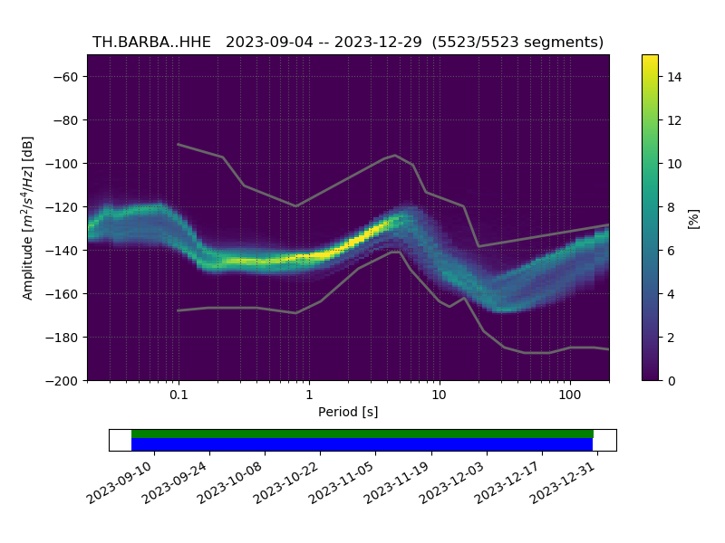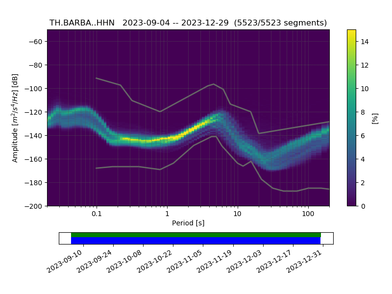 PPSD (Probability Power Spectral Density) of last year, vertical component, transformed to acceleration display.