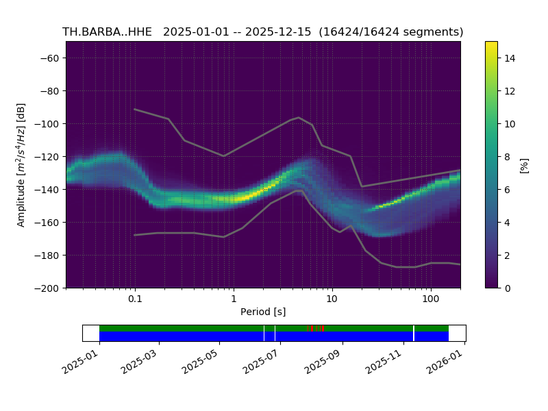 From hourly PSD spectra one frequency is selected and displayed over the whole time span of available data (blue points). A median average curve is computed and plotted in red. Broadband stations will be displayed at frequency 0.15 Hz all other stations at 0.95 Hz. At 0.15 Hz a clear seasonal variation (low in summer, high in winter) should be visible.