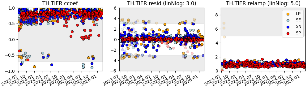 Correlating signals of teleseismic events between stations reveal possible issues in timing, waveform shape and amplitudes. The x-axis on all diagrams is the event time. The left figure contains the correlation coefficients ranging between -1 and 1. The area between -0.7 and 0.7 is shaded in gray to indicate bad correlation values. The central figure shows the time residuals (in seconds, vertical axis) of the correlation maximum. In an ideal case the values are aligned along the dashed zero line. A mean deviation from zero indicate station corrections in travel time. To be able to display also large residual values the shaded areas at the bottom and on top provide a logarithmic scaling rather than the linear scaling in the central part. Residuals corresponding to low correlation coefficients (below 0.7) have a reduced alpha value appearing less bold in the figure. The right diagram displays the relative amplitude measurements of this station compared to all others on the vertical axis. The dashed line indicates a relative amplitude of 1. The shaded area again indicates logarithmic scaling for large amplitude deviations. Red points result from WWSSN-SP simulations, orange from SRO-LP. Dark blue and light blue show results for horizontal components N and E, respectively, using a KIRNOS simulation. This figure is updated on every new event analysed.