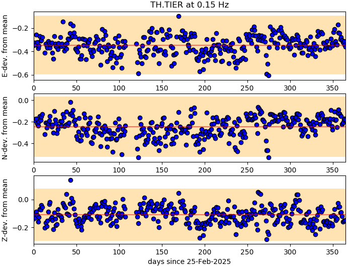 The amplitude stability is checked at a frequency of 0.15 Hz for broadband stations and 1 Hz otherwise. For each of the last 365 days an average PSD amplitude at this frequency is determined and compared with the average of all other stations. The figure shows the deviation from this global average together with the mean (red line) and a tolerance area based on multiples of the standard deviation (orange area). A station with stable amplitudes has all day dots in all components within this range. Trends or steps in this amplitude display may indicate problems with data or metadata. This figure is updated daily.