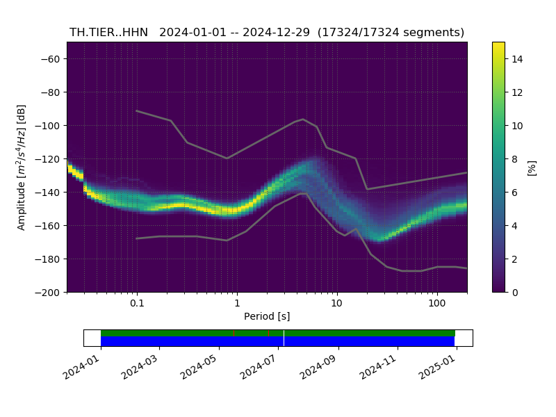 PPSD (Probability Power Spectral Density) of last year, vertical component, transformed to acceleration display.